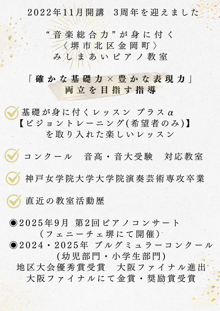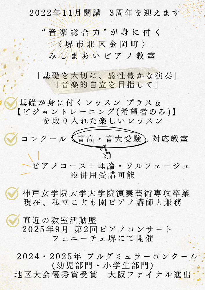 音楽大学在学中からピアノ指導を開始、大学院卒業後は奏者として活動を続けながら音楽教室に勤務、退職後 結婚出産を経て、2022年11月 堺市立金岡小学校・金岡南中学校区にて〈みしまあいピアノ教室〉を開講致しました。