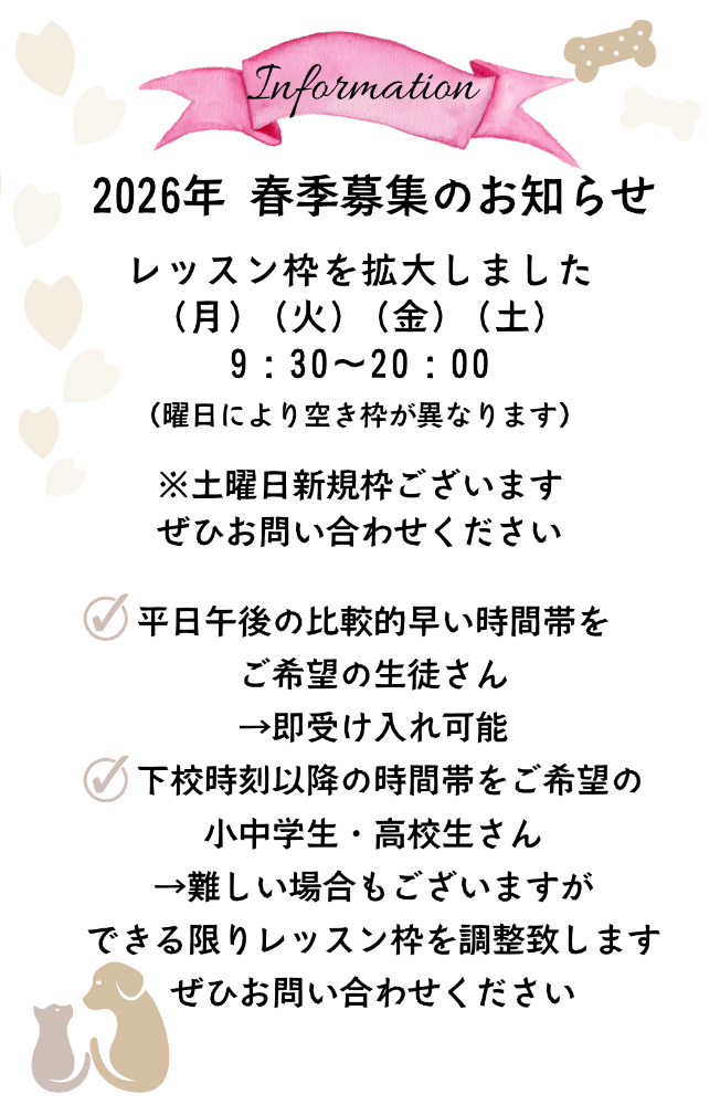 また保護者様には、お子さんの成長を見守り、共に喜び、悩みがあれば共有させていただき、ご相談を重ねながら、レッスンの充実を図っていきたいと思っております。